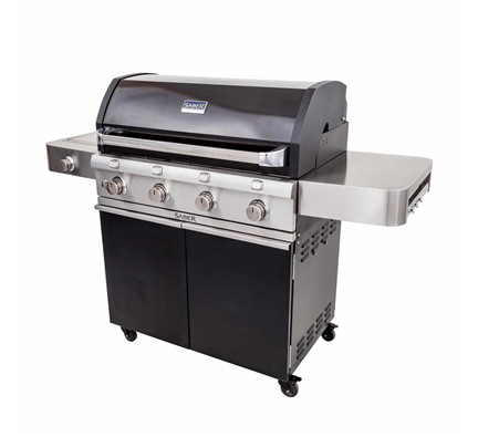 he SABER Cast Black 4-Burner Gas Grill comes with a more reliable ignition system featuring electrodes at each burner, grate-level temperature gauges and sturdy cart design. It also features a black porcelain lid with cast-aluminum end-caps and a black powder-coated cabinet. Plus, enjoy a single side burner, 304 stainless steel side shelves with tool holders and a towel bar and double-access doors.